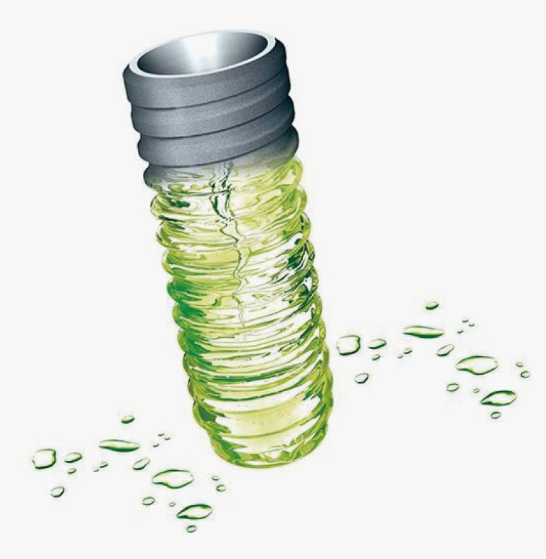 亲水种植牙采用瑞士进口亲水种植体,在术前、术中、术后严控感染,提高骨结合效率,提高种植牙安全度、成功率。亲水种植体不同于传统种植体,传统种植体在生产保存过程中接触空气会形成一层氧化层,使其具有疏水性,因此会排斥液体,植入牙骨后需要一定的时间将氧化层代谢掉才能产生骨结合。而活性亲水种植体在惰性气体保护下进行生产处理,植体置于生理盐水中保存,由于避免了空气接触造成的氧化,表面具备优良的润湿性和亲水性,可快速附着血液成骨细胞与蛋白,从而加快种植体周围的骨结合。